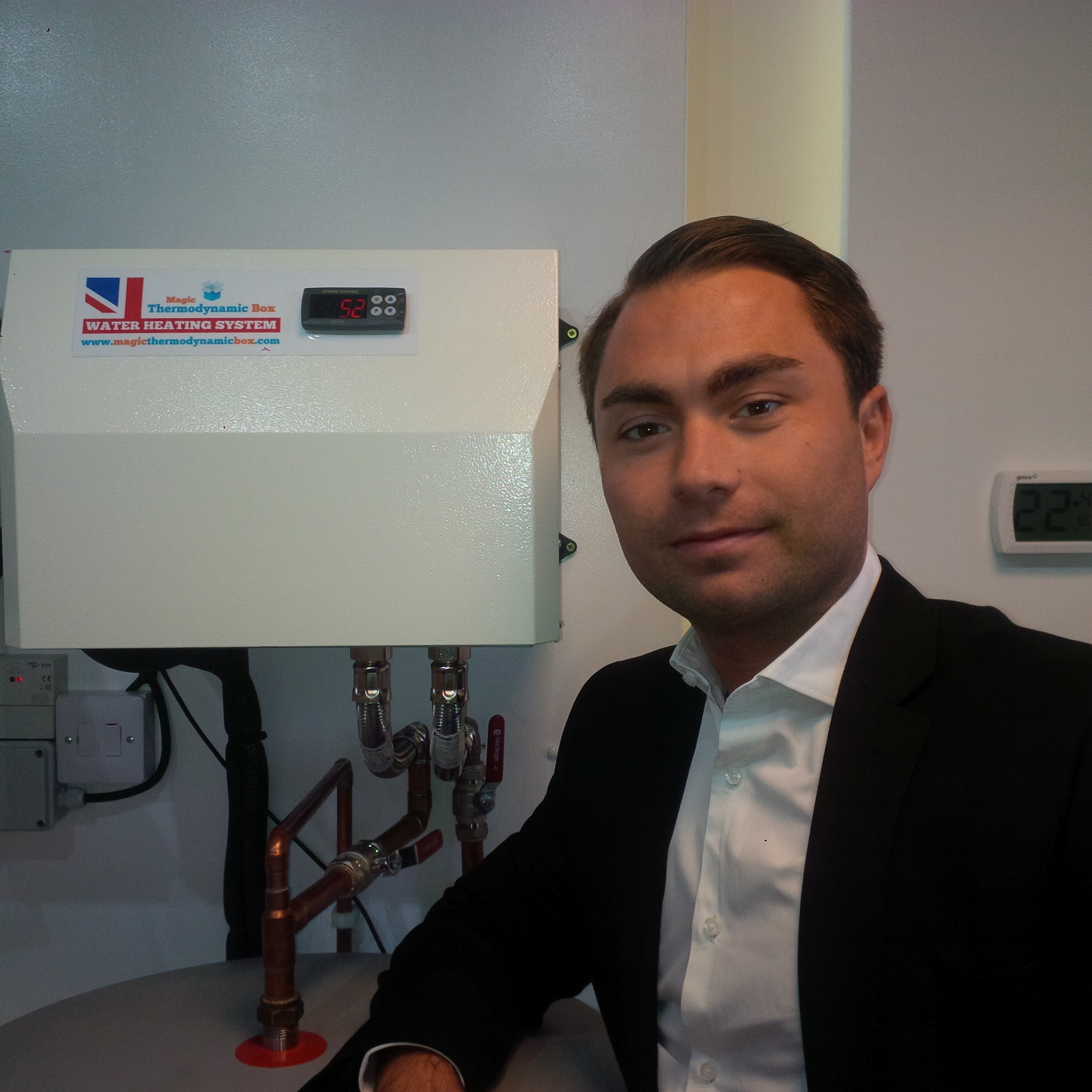 Magic Thermodynamic Box, a renewable energy company, has developed and manufactured a system by which heat taken from the environment is pumped into the hot water cylinder in a house, heating water 24 hours a day.