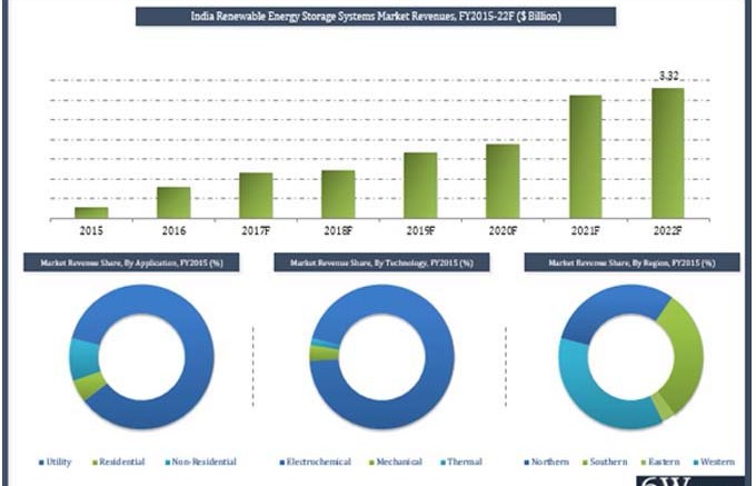 According to 6Wresearch, India Renewable Energy Storage Systems Market is forecast to reach $3.32 billion by 2022. Indian government has revised its renewable energy installed capacity target to 175 GW by 2022, which is expected to fuel the market for the renewable energy storage systems. In the forecast period, solar based energy storage systems are projected to hold dominant share of the market.
