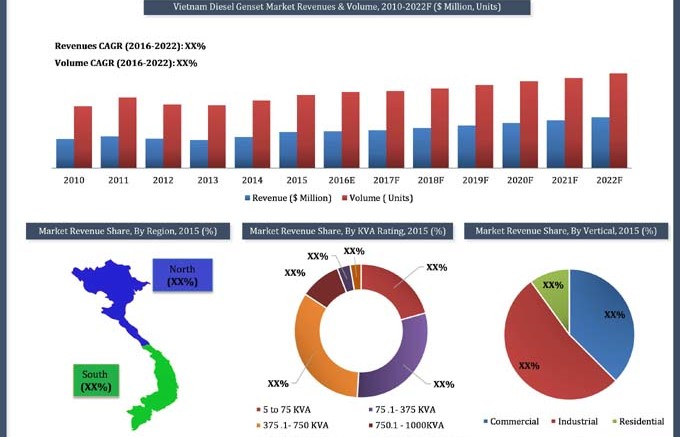 Vietnam Diesel Genset Market (2016-2022): Market Forecast by KVA Ratings (5 KVA-75 KVA, 75.1 KVA- 375 KVA, 375.1 KVA-750 KVA, 750.1 KVA-1000 KVA, 1000.1 KVA -2000 KVA and 2000.1 KVA & Above), Verticals (Commercial (Hotel, Public Infrastructure, Telecom Towers, Commercial Centers, Healthcare and Others), Industrial (Electrical & Electronics, Textile, Food Products, Chemicals, Fabricated Metal Products, Basic Metals, Power Utility and Others) and Residential), Regions (Northern and Southern) and Competitive Landscape
