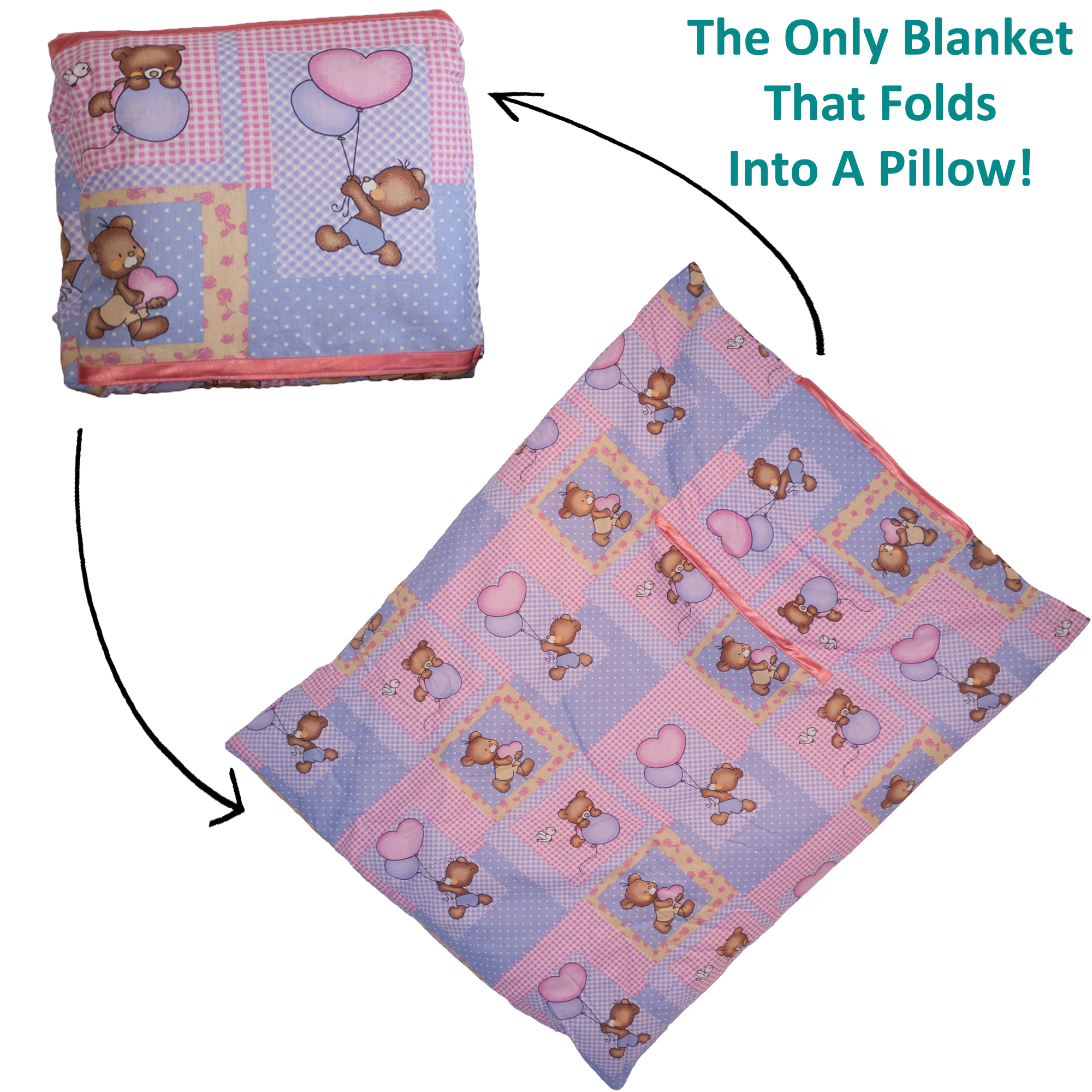 Our pillow blankets come in two sizes, one baby pillow blanket for newborns to toddlers and one Kids pillow blanket for toddlers and up. We have four designs currently, a blue bear for baby boys, a pink bear for baby girls, purple and pink Disney Princess for the young Princess’ and Cars for the little Boys.